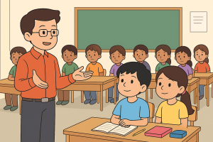 Pak Yakin masuk ke kelas dan menenangkan anak-anak.