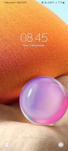Di layar HP ada angka yang menunjukkan jam, tanggal, dan persen baterai.