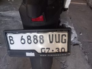 Di bagian depan dan belakang motor atau mobil ada tulisan berwarna hitam dan putih berisi huruf dan angka.