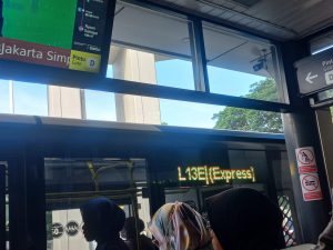 Di bus ini, kita bisa melihat nomor seperti “L13E” yang menunjukkan jalur dari Ciledug ke Blok M.