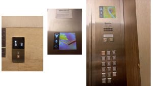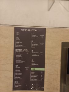 Di dekat lift, biasanya ada papan petunjuk lantai (disebut floor directory).